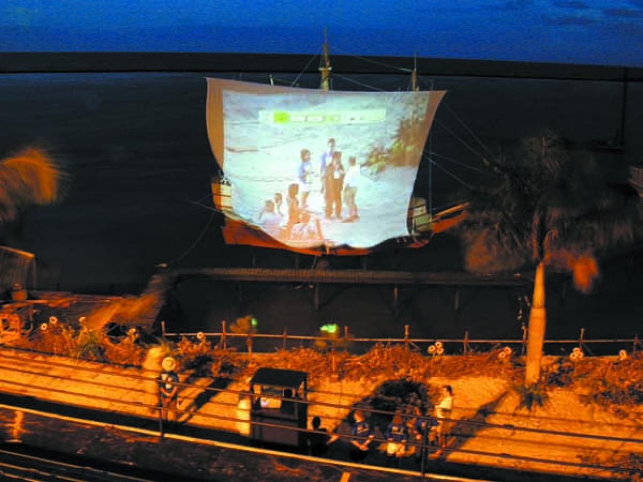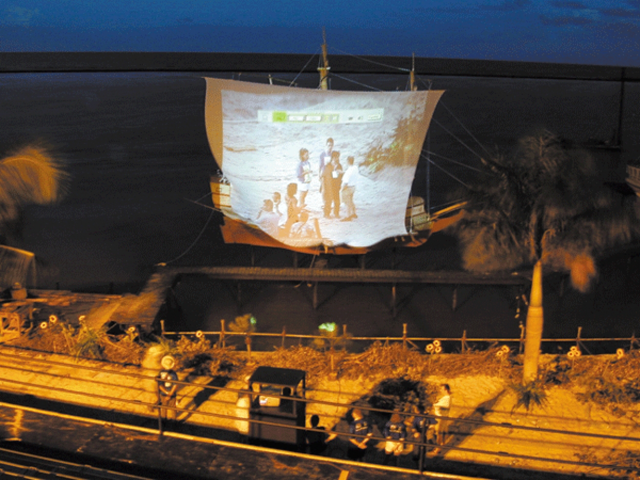 Audiovisual show depicting the arrival of the Portuguese in Brazil in the XVIth century: audiovisual projections, actors, dancers, musicians, staging, lighting, fireworks, laser and fx. On eight stages over the sea. Stands for 20.000 spectators. Projection on a semi-transparent fabric (sails of ships) and water screen. Outdoors filming in Salvador de Bahia and Porto Seguro (Brazil).